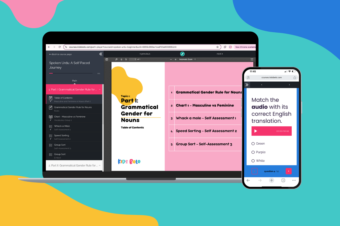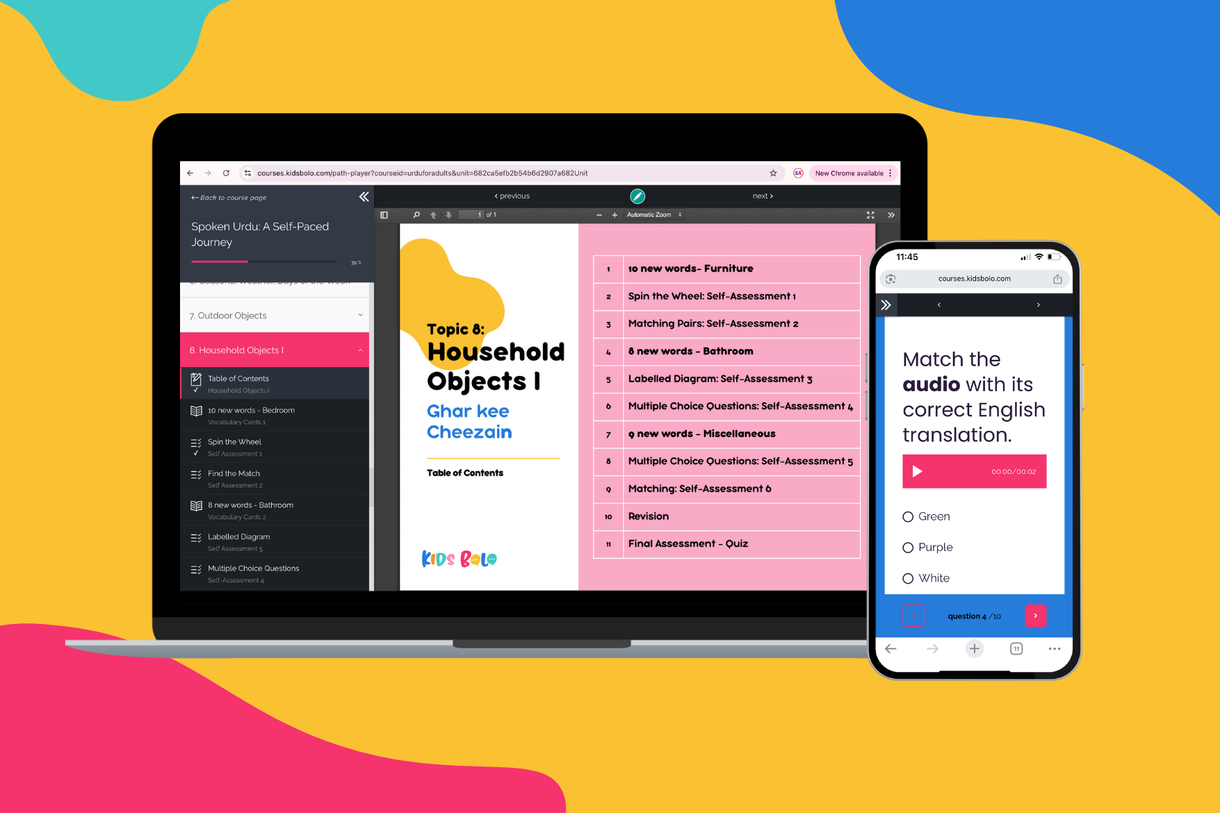 This level focuses on understanding and using everyday Urdu words and phrases written in Roman script. Covering over 400 common objects and expressions across topics like colors, body parts, food, and emotions, it helps learners connect Urdu words to daily life. By the end of this level, students will be ready to recognize, recall, and use basic Urdu vocabulary in simple conversations.